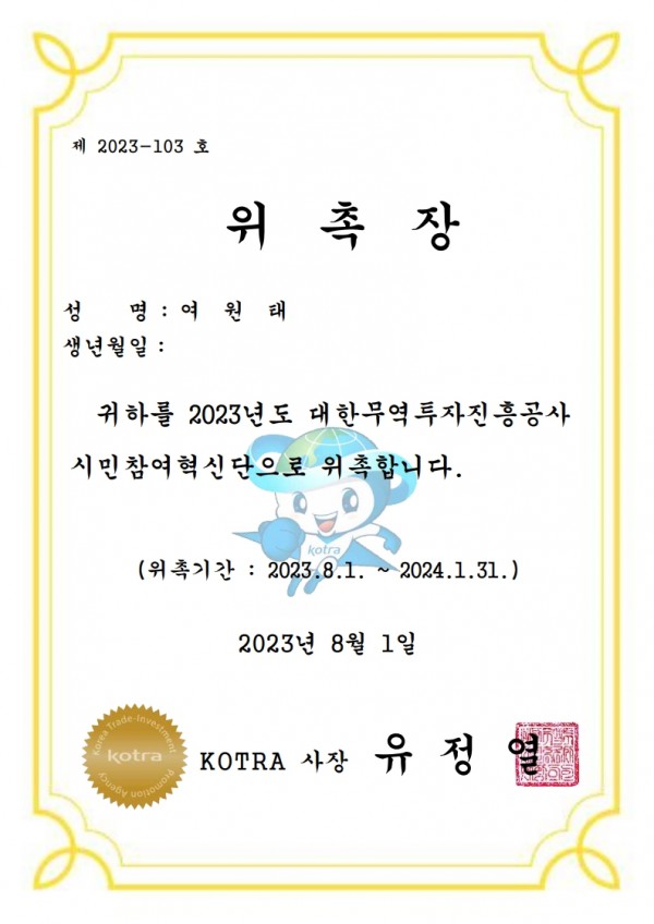 Letter of Appointment of KOTRA Citizen Participation Innovation Group 관련링크 mondereve 427 0 본문 Letter of Appointment of KOTRA Citizen Participation Innovation Group SHARE THIS PAGE 목록